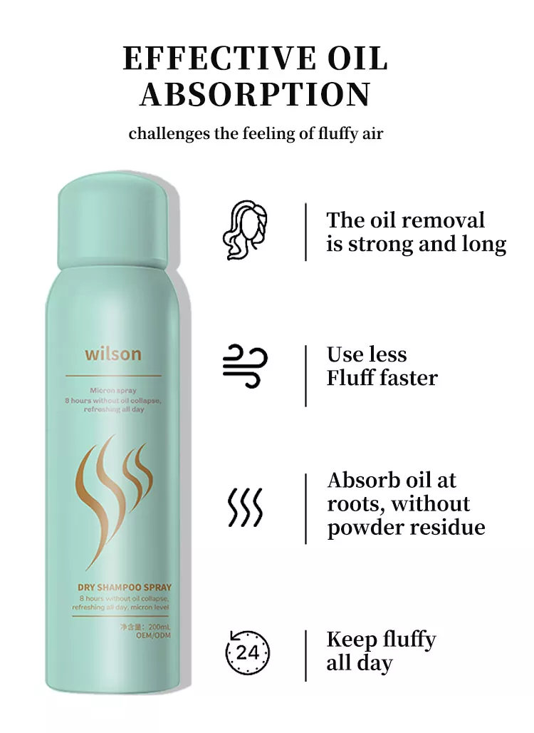 Wilson Instant no-wash kølig tør shampoo spray har reddet mange oliehoveder midlertidigt gå ud kan ikke vaske hårproblemet, det vigtigste råmateriale er risstivelse, stivelse har porøs struktur, adsorptivitet, er et almindeligt hygroskopisk adsorptionsråmateriale, kan effektivt absorbere overskydende olie i hovedbunden og rense håret for at rense håret for og tilføre snavs og spray elektrostatisk snavs, spray. produkter fra håret. Føl dig frisk og naturlig efter brug.